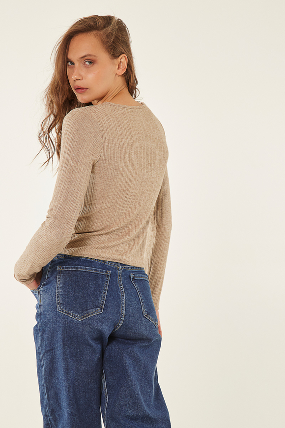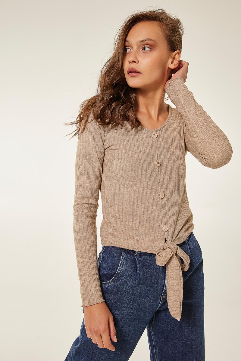 Μπλούζα με δέσιμο και κουμπιά εμπρός-Μπεζ
