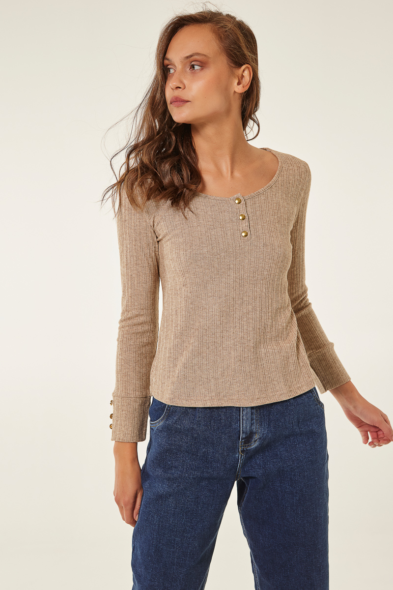 Μπλούζα ριπ με κουμπιά εμπρός και στα μανίκια-Μπεζ
